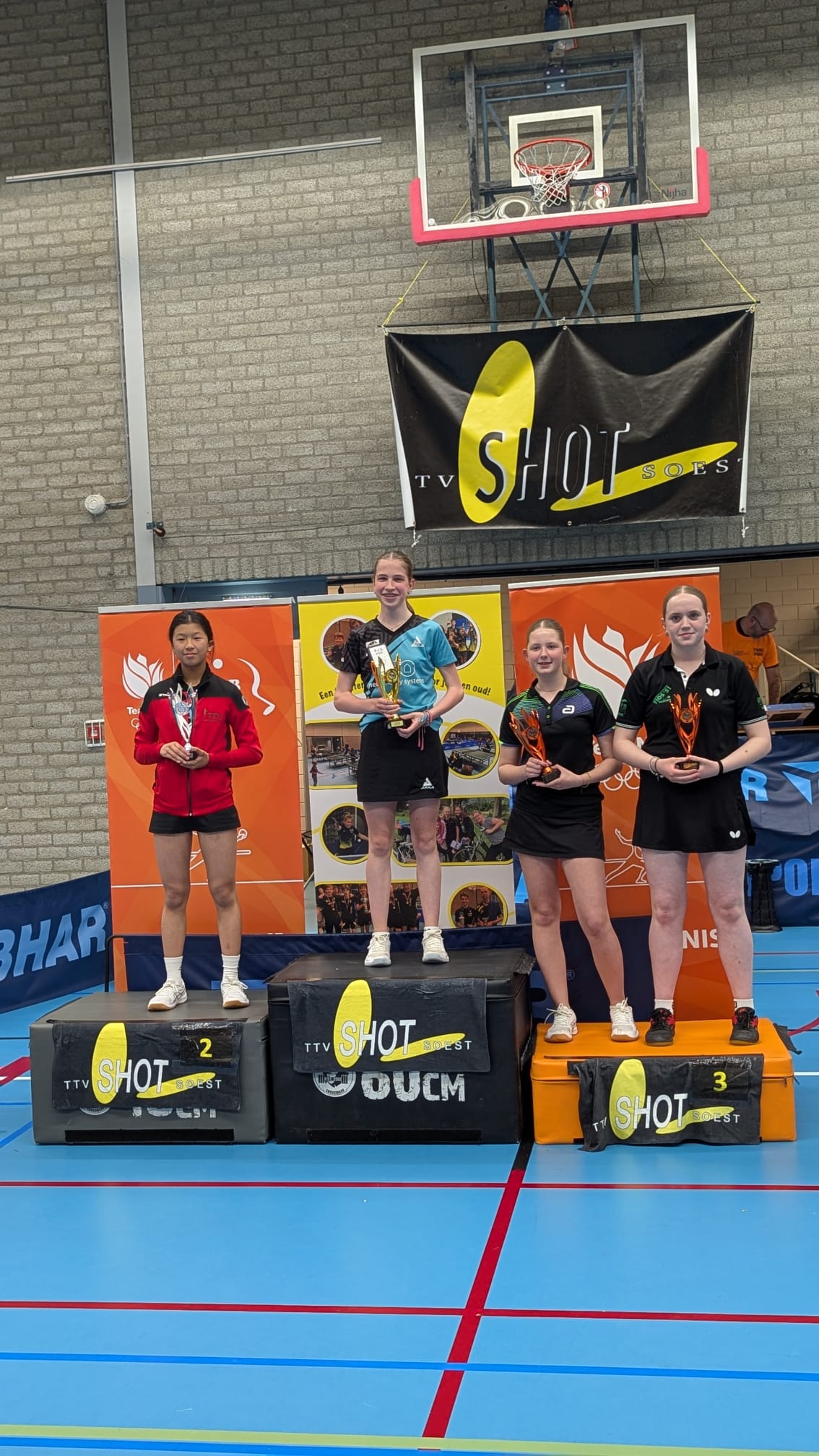 Rest mij nog 2 (Veldhoven) prestaties te vermelden. Charlotte en haar dubbelpartner Natalia hebben een tweede plaats behaald. Ze stonden overigens al direct in de halve finale (?1). De organisatie hoefde nog net geen kinderen van straat te plukken om toch maar een deelnemersveld te hebben maar veel scheelde dat niet. Met 11-9 in de vijfde werd verloren van Joes en Juul. Jasper en zijn maat Ayaan Marathe van ttv Ede hebben brons behaald.