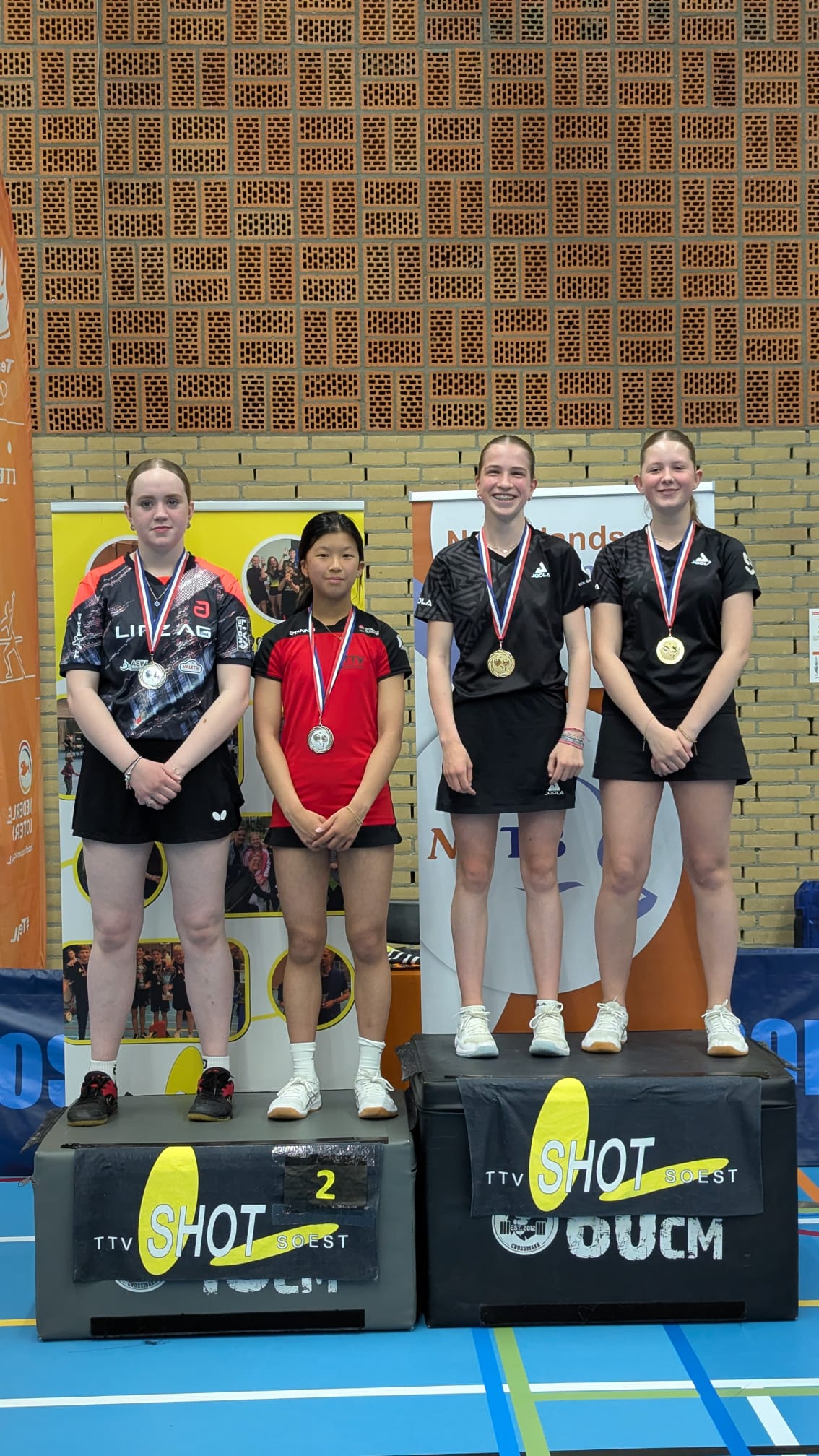 Rest mij nog 2 (Veldhoven) prestaties te vermelden. Charlotte en haar dubbelpartner Natalia hebben een tweede plaats behaald. Ze stonden overigens al direct in de halve finale (?1). De organisatie hoefde nog net geen kinderen van straat te plukken om toch maar een deelnemersveld te hebben maar veel scheelde dat niet. Met 11-9 in de vijfde werd verloren van Joes en Juul. Jasper en zijn maat Ayaan Marathe van ttv Ede hebben brons behaald.